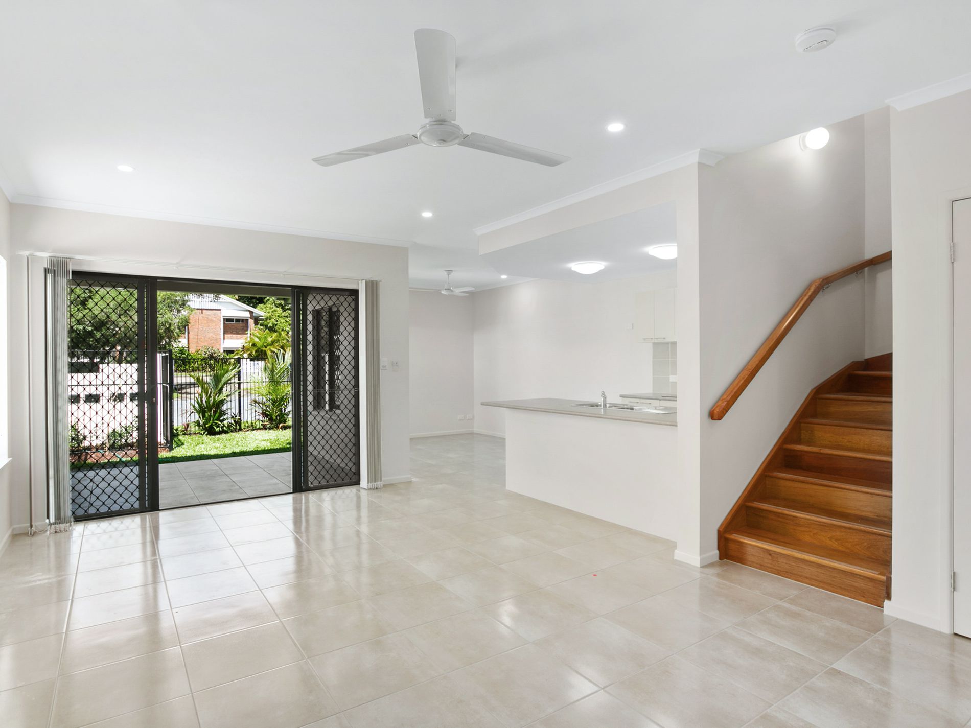Downstairs features an open plan, air-conditioned living and dining area flowing out to a covered outdoor patio. The kitchen includes stainless steel appliances, a dishwasher, a breakfast bar, and plenty of storage.